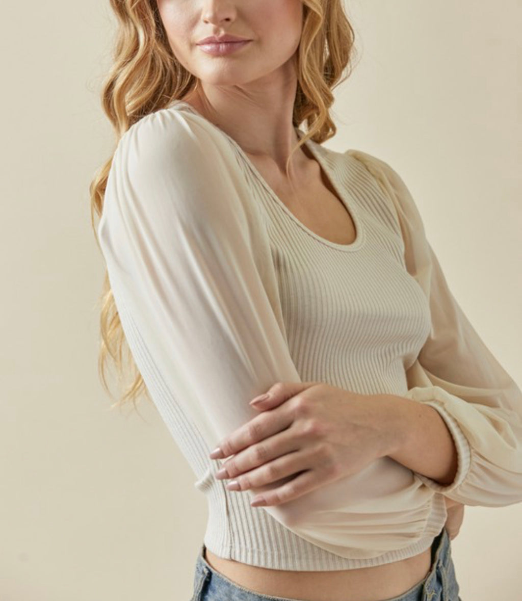 Rhinestone Pearl Detail Round Neck Puff Sleeve Top
