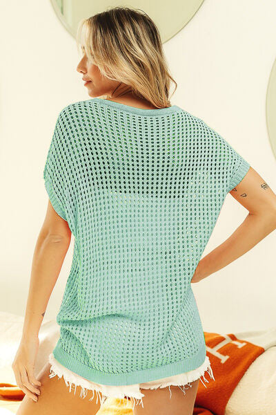 The openwork short sleeve knit cover-up is a stylish and versatile piece that adds a touch of sophistication to your outfit. Featuring intricate openwork details and short sleeves, this cover-up is perfect for adding a layer of texture to your look. The knit fabric provides comfort and warmth, making it ideal for transitioning between seasons or lounging at home. Whether worn over a swimsuit at the beach or paired with a tank top and jeans for a casual day out, this cover-up offers a chic and effortless style. The short sleeves add a breezy and relaxed feel, perfect for staying cool on warmer days. Effortlessly chic and easy to style, the openwork short sleeve knit cover-up is a versatile and fashionable addition to your wardrobe.