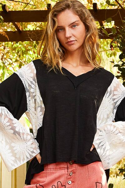 POL Lace Detail V-Neck Flare Sleeve Blouse